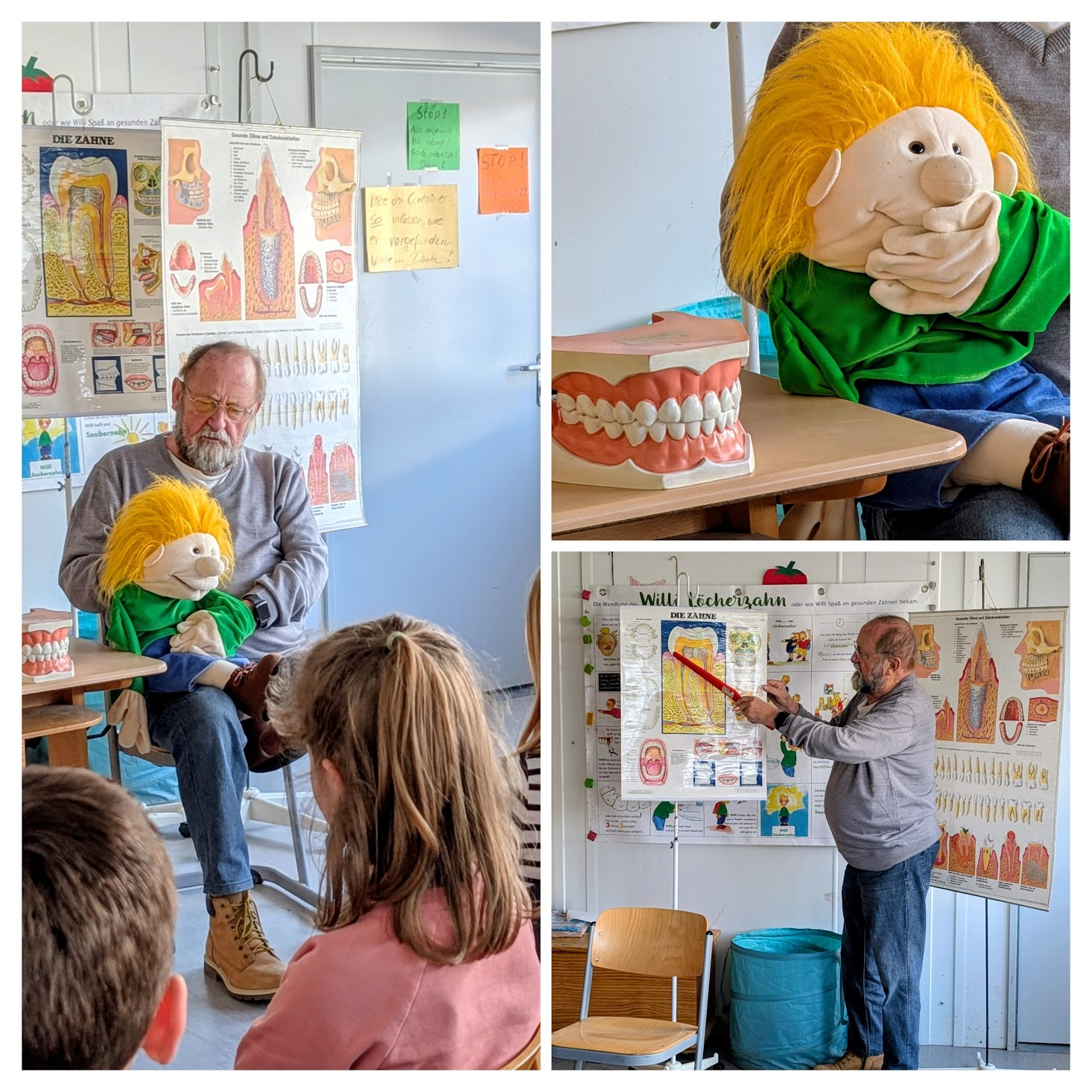 Zu Beginn eines neuen Kalenderjahres bekommen wir im Zuge unseres Gesundheitsprogramms regelmäßig Besuch vom Schulzahnarzt Dr. Thomas Klippert. Neben der Untersuchung der Erstklässler hält er im Rahmen der Zahngesundheitspflege Rheinland-Pfalz in jeder Klasse einen kindgerechten Vortrag über die richtige Mundhygiene. Dabei unterstützt ihn seine Handpuppe Willi und ebenso das Maskottchen der LAGZ Max Schrubbel: