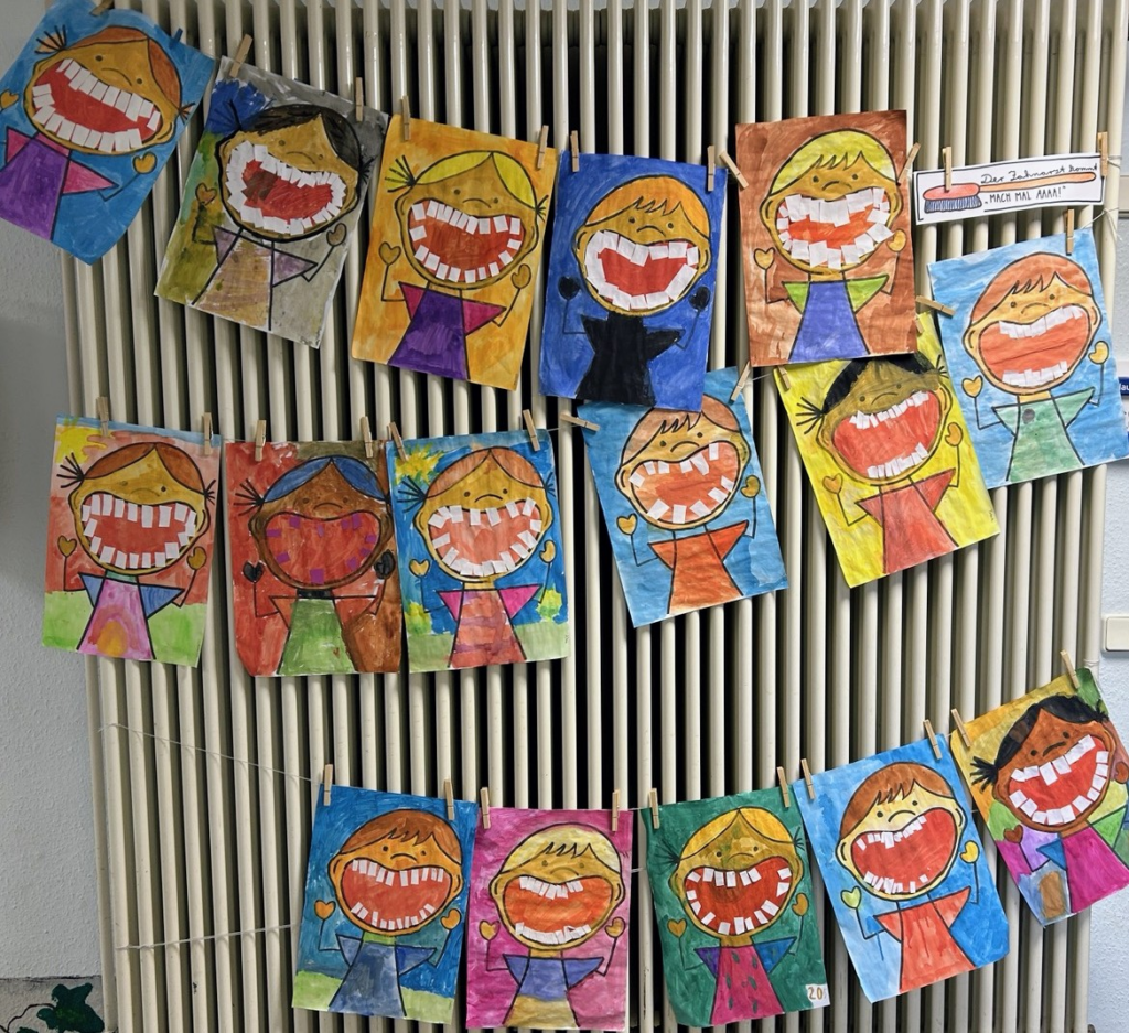 Die Kinder der ersten Klassen beschäftigten sich auch in ihrem Kunstunterricht mit dem Thema: „Der Zahnarzt kommt – Mach mal AAAA!“. Dabei entstanden wunderbare Zahnbilder :