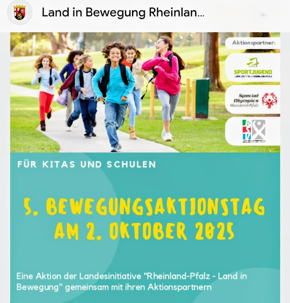 Am 2. Oktober nahm unsere Schule erneut am Bewegungsaktionstag des Landes Rheinland-Pfalz teil. Ziel der Aktion ist es, ohne großen organisatorischen Aufwand an diesem Tag Kinder und Jugendliche mit Spaß in Bewegung zu bringen. Die Institutionen sind frei in der Einbindung der mind. 15-minütigen Bewegungseinheit. So entschied sich das Schulteam in diesem Jahr bei herrlichstem Sonnenschein gemeinsam mit allen Kindern der Schule eine gemeinsame Runde um den Martinsberg zu laufen. Die Kinder waren motiviert dabei und schnell waren die rund 3 Kilometer absolviert. Zur Belohnung bekam jedes Kind ein „Bewegungsband“ für die erfolgreiche Teilnahme und zur Motivation, auch weiterhin in Bewegung zu bleiben. Das war ein wirklich schönes & kurzweiliges Event!